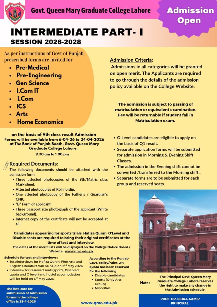 The Principal Govt. Queen Mary Graduate College, Lahore reserves the right to make any change in the Admission schedule.